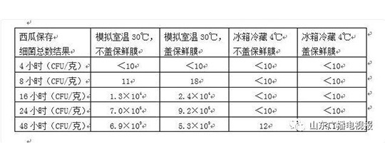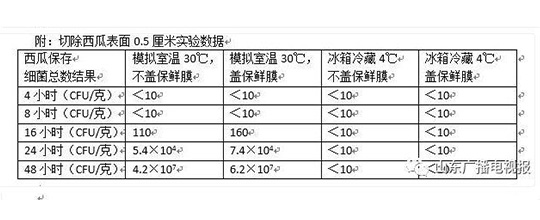 出现显著差别的是模拟室温30℃保存16小时后,切除表面的西瓜,菌落总数明显比没有切除表面的西瓜要少100倍。冰箱里冷藏存放时,切除表面的西瓜存放48小时的细菌总数均<10。